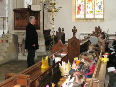 On the 6th of January, the first day of the new term, we had a special assembly at the church to celebrate Epiphany. Over the Christmas holiday we made crowns and brought them into school. We processed down to the church, led by the choir who sang 'Lord We're Following Your Star'.